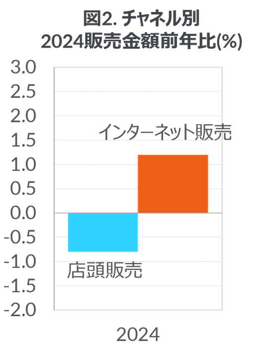 販売チャネル別で見ると、インターネットは金額前年比1%増となった(図2)。インターネットの成長は続いているが、2023年にその勢いが弱まり始め、2024年でさらに鈍化した。一方で店頭販売は金額前年比1%減と縮小する動きとなった。