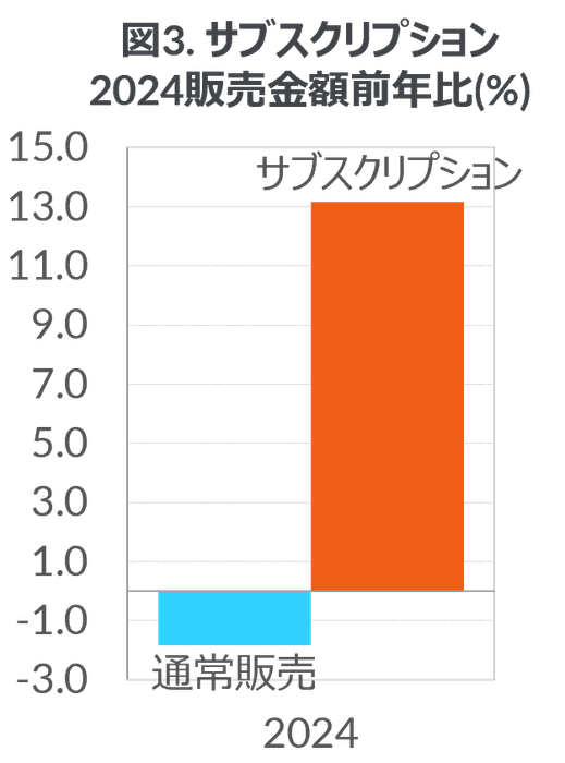 サブスクリプションサービスが好調に推移した。通常販売では2%減だったが、サブスクは金額前年比で13%増と二桁成長を記録した(図3)。ユーザーの囲い込みが見込めることから、メーカーだけでなくリテーラーも独自のサブスクリプションサービス提供に注力する動きがあり、またユーザーにとっては価格面でのメリットがあることから今後も成長を続けていくと考えられる。