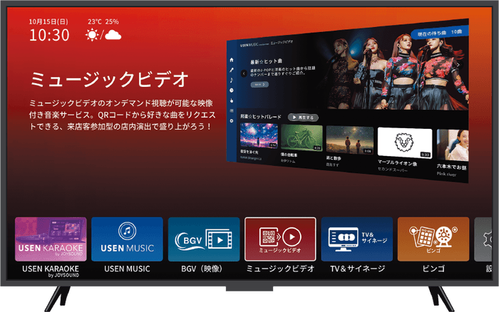様々な動画配信サービスを楽しめる”スマートTV“に、BGMプレイヤーを内蔵。さらに来店客のリクエストに対応したミュージックビデオの再生やサイネージなども利用可能です。画面ひとつで多彩なエンタメ空間をつくることができ、サービス品質向上に貢献します。