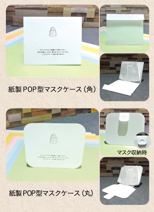 形状は折り畳み式、自立式POP型の2種類。素材はリサイクルに適した石灰石を主成分としたLIMEX(ライメックス)*や間伐材、紙素材をラインアップしています。製作は1枚から可能で、当社のwebサイトで配布するテンプレートを使用し入稿することで、オリジナルデザインのマスクケースを作ることができます。これにより、店舗などでのオリジナルのアメニティとしてや企業のノベルティなどへ活用ができます。