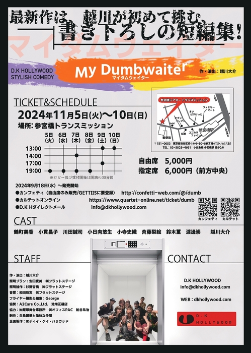 D.K HOLLYWOOD『My dumbwaiter』が2024年11月5日 (火) 〜 2024年11月10日 (日)に参宮橋トランスミッション(東京都渋谷区代々木4-50-8)にて上演されます。
