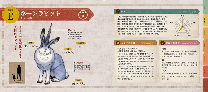 皮剥ぎや部位の切り離しなど本格的な工程をイラストで解説し、得られる素材や危険度もわかりやすく紹介。さらに、コカトリスやサハギンなどの肉を使った“おいしい食べ方”まで収録。