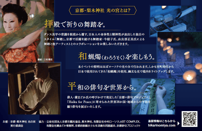 萩の名所かつ京都三名水のうち唯一現存する「染井の水」を有する京都御所東に隣接する「梨木神社」において、会場の設えには、室町時代から日本で使われてきた伝統的なローソクである「和ローソク」による灯りの演出を施し、世界中から集めた平和をテーマとした俳句の短冊が設置された参道を、装束をまとった宮司を先頭に「和蝋燭(ろうそく)」を手にした参加者が拝殿までを歩く演出を体感していただきます。漆黒の中、参加者が持つ和蝋燭と、能舞台を照らす灯りで、が誇る感動エンターテイメント・ギアの企画演出を行うART COMPLEXによる、ここでしか見られない舞踏を行います。