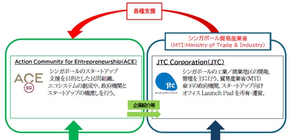 当社とACE、JTCによるスタートアップ・エコシステムの連携強化に向けた本協定締結による3者の関係性は、次のとおりです。ACE経由でJTCの各プログラムの紹介が可能であるなど、ACEとJTCは密に連携しており、ACEとJTCを組み合わせることで、関西のスタートアップのシンガポールへの進出と成長が一層期待できます。
