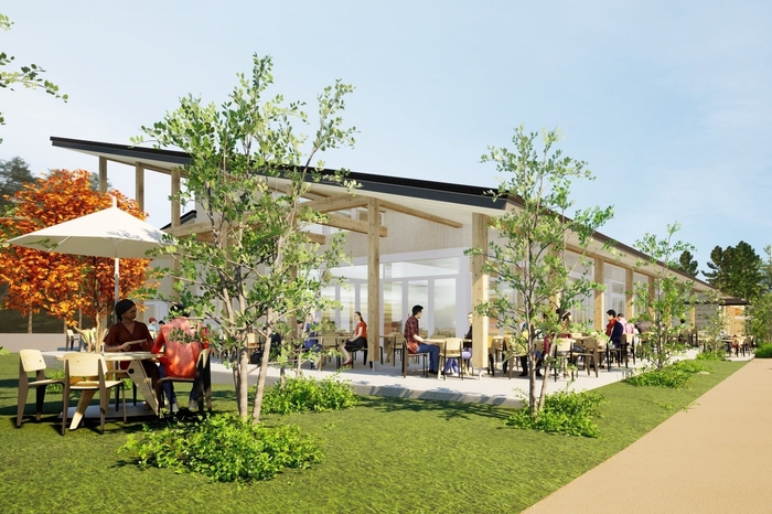 新たにオープンするレストランは、牧場の広大な自然を一望できる開放的な空間で、訪れるすべての方に特別な食体験を提供します。テラス席やパラソル席等約400席を備え、従来の8人掛け1テーブルを、4人掛け席仕様に変え、よりリラックスしたカジュアルな雰囲気をご提供するとともに、テラス席も従来より1.5倍に増やし、自然の景観を楽しみながらお食事をお楽しみいただけます。ペット同伴でお食事いただけるパラソル席もございますまた随所に環境に配慮した取り組みや、千本松牧場ならではのアイデンティティを盛り込んだモニュメント・壁材・スポット等も登場します。