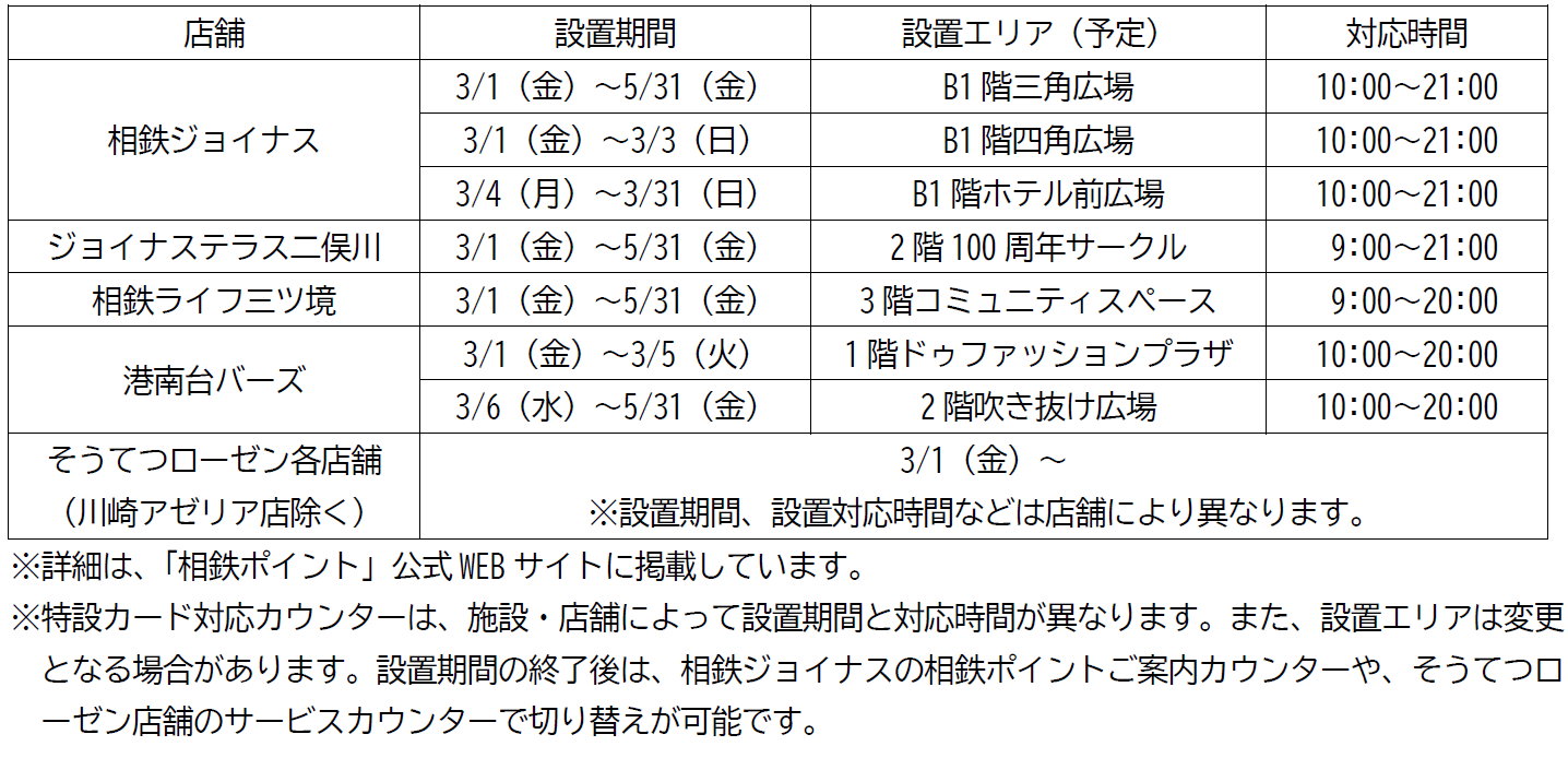 ・主な特設カード対応カウンター(切り替えだけでなく「相鉄ポイントカード」の新規発行も可能です)