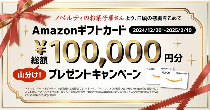 ビーテック株式会社は、運営するECサイト【ノベルティのお菓子屋さん】にて、日頃の感謝をこめてAmazonギフトカード 総額 100,000円 山分け プレゼントキャンペーン」を実施いたします。