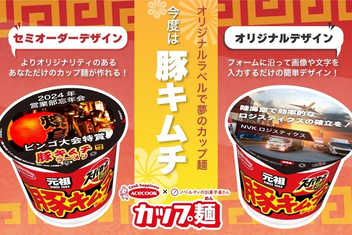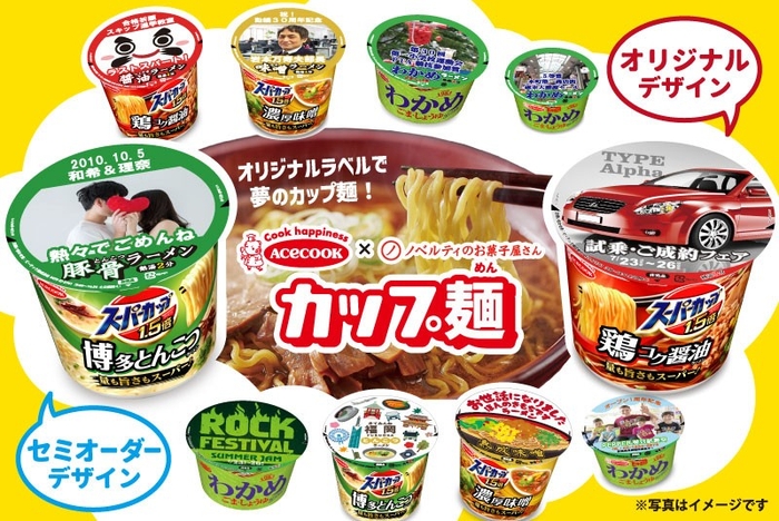 定番のわかめラーメンやスーパーカップにオリジナルラベルを装飾可能。