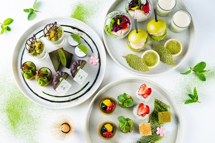 スイーツプレートは、千休の看板商品“抹茶玄米カヌレ”や“米粉の抹茶フィナンシェ”のほか、千休の抹茶もち生大福からインスパイアした抹茶いちご大福、国産マロンペーストと単一品種の抹茶を使用した抹茶モンブラン、ホテル限定ブレンド抹茶を使用した抹茶シュークリームなど味わいの違う抹茶スイーツをご堪能いただけます。