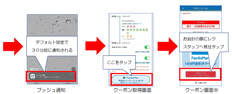 本キャンペーンは、近鉄名古屋駅から松阪駅間の区間内で使用する近鉄特急の特急券を近鉄アプリからご購入いただいたお客様に対し、近鉄リテーリングが運営する駅構内のファミリーマート(以下、「近鉄エキファミ」という。)で利用できるクーポンを提供します。(100円割引クーポンを先着25,000名様に提供)