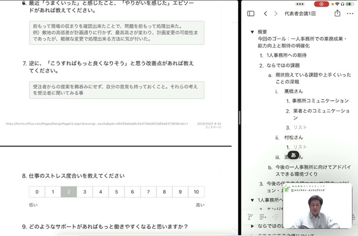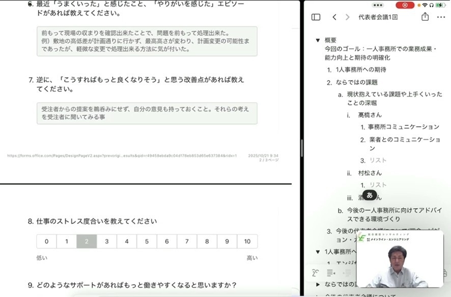 今回の会議では現場で活躍する現場社員3名が参加し、それぞれの経験と課題、会社への期待を発信。代表は、「単なる業務遂行ではなく、技術と人間性を兼ね備えた真のプロフェッショナルを目指す」という強い想いを示しました。