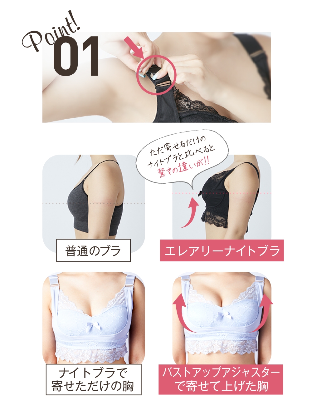 他にはないアジャスター付きで、バストを寄せるだけでなくしっかり上げて、寝ている間も上向き美バストをキープできます。