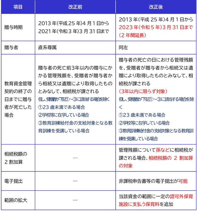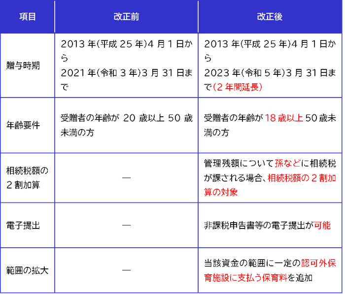 当該措置は、贈与を受ける人一人当たり1,500万円まで(学校等以外の者に支払われる金銭については 500 万円まで)の教育資金が非課税になる制度ですが、改正概要と適用時期は以下のとおりです。