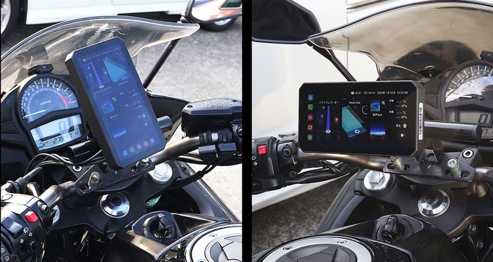 5インチモニターでコンパクト設計。縦置き横置きが切り替えられバイクに合わせて設置できます。
