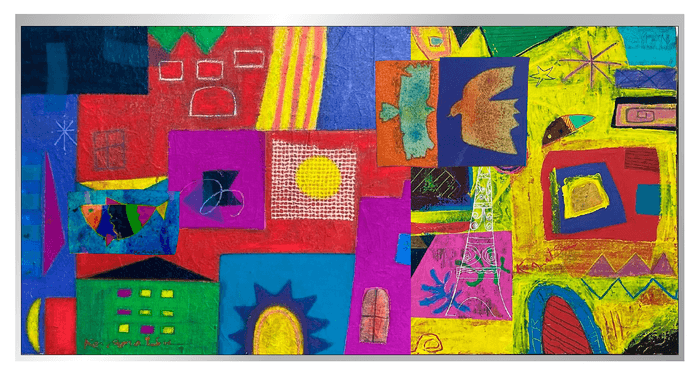 作品のタイトルは「太陽と羽ばたく港まち」です。天津氏の作品に見られる太陽や街並みなどのモチーフが赤や黄色を基調にしたダイナミックな配色で彩られています。さらに名古屋港の金城ふ頭から広がる外海を泳ぐ「さかな」や渡り鳥の経由地となる干潟を象徴する「とり」を組み合わせ、金城ふ頭の未来へのエネルギッシュな発展を表現しています。
