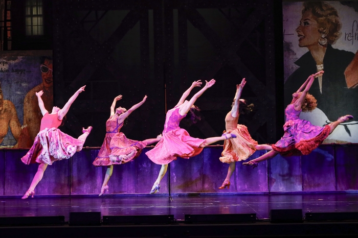 「America」では故郷プエルトリコより今住んでいるアメリカが一番!と、シャークス(プエルトリカン系)の女性たちがパワフルに歌い踊る。その華やかさといったら!6名の女性はオレンジとピンクのビビッドな色のドレスを着ており、とても洗練されていて美しい。それに合わせたのか、空の色もオレンジピンク。大きな広告の看板が掲げられているのが印象的だが、これは裕福な白人に向けた広告で当時の移民たちには手の届かないものだったとか。格差社会を暗喩した、このプロダクションならでは演出が効いている。