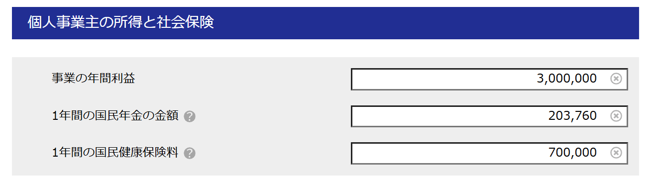 マイクロ法人を設立すべきか判断するために、画面の指示に沿って「事業の年間利益」「1年間の国民年金の金額」「1年間の国民健康保険料」をご入力ください。なお、シミュレーションであるため、正確な値が手元にない場合は概算値でも差し支えありません。
