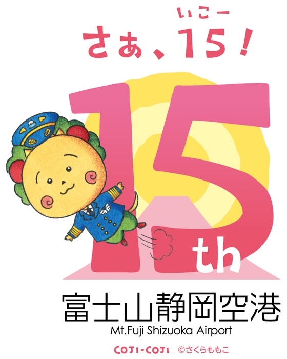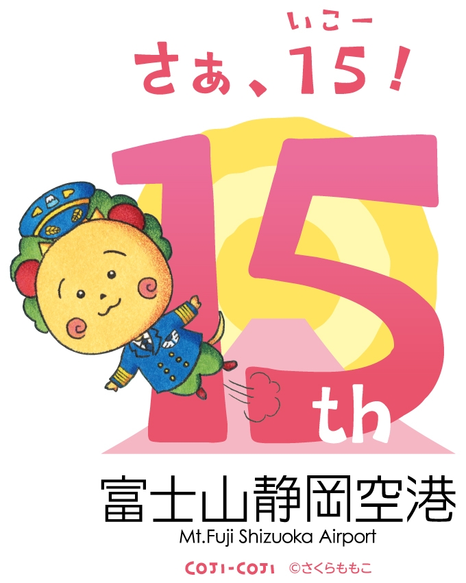 開港15周年のロゴマークは、富士山をバックに、空飛ぶ「コジコジ」と「15」の数字を組み合わせ、「コジコジ」の世界観に通ずる、“かわいくて少しゆるい”イメージでデザインされています。開港15周年ロゴは、富士山静岡空港ターミナルビルの館内装飾や、ステッカープレゼントなどにも使用され、アニバーサリーイヤーを盛り上げます。