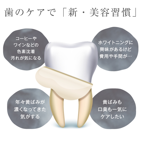 私たちが毎日行っている習慣の一つ、歯磨き。この歯磨きの多くが研磨剤でのブラッシングにより歯の表面のエナメル質が傷つきやすく、細かな傷にコーヒーやお茶などのステインが入り込み着色の原因になるということに着目し、ブラッシングすることで歯を削らず吸着して落とす歯磨きパウダーを開発しました。