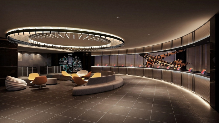 「OMO ベース」は、街の滞在の拠点。「ご近所マップ」やワークスペースがあり、旅の計画をしたり、ひと休みしたりと、思い思いの時間を過ごすことができます。駅から通路でつながる2階は飛行機のエンジンや座席をモチーフにした内装で、旅の始まりを感じさせるワクワクするデザインです。フロントでは、オリジナルの「OMO」デザインの飛行機のオブジェが出迎えます。また、スムーズにチェックイン・チェックアウトできる導線が特徴です。駐車場や空港への送迎バス乗り場もある1階には飛行機の窓や、椅子をイメージした内装のラウンジが備わり、旅の計画を立てたり、仕事をしたり、思い思いに過ごすことができます。