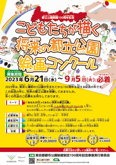 2023年は、東京に最初の5公園が生まれてから150周年を迎える記念の年です。この記念の年に、将来の都立公園を想像してみませんか。多くの作品のご応募をお待ちしております。