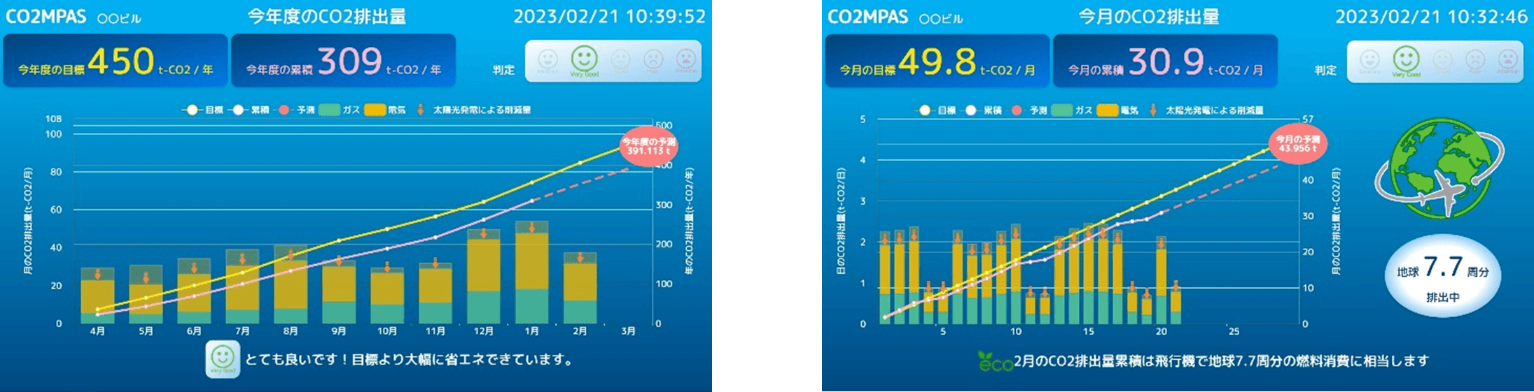 サイネージ機能ではエネルギー供給会社ごとの排出係数を用いてCO2排出量に換算した排出実績値を年月日のグラフで表現します(図2)。また蓄積したデータから、各月排出量の割合を把握することで建物の特性に応じた予測値を算出します。これらの実績値・予測値と年度の初めに定めた目標値から省エネに対する判定を行うことも可能です。