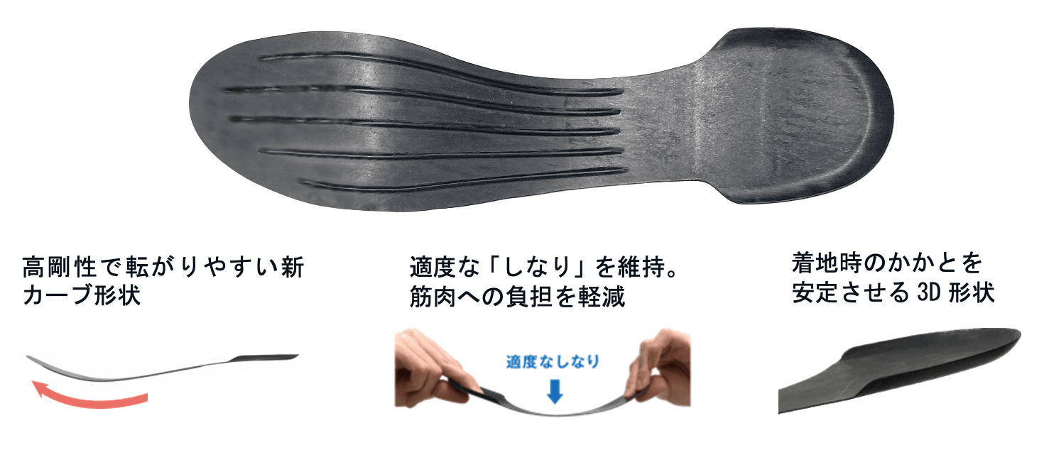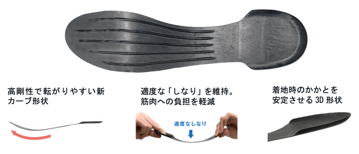 ソール全体に高剛性で転がりやすいカーブ形状とリブ溝の「3Dパワーカーボン」を内蔵。