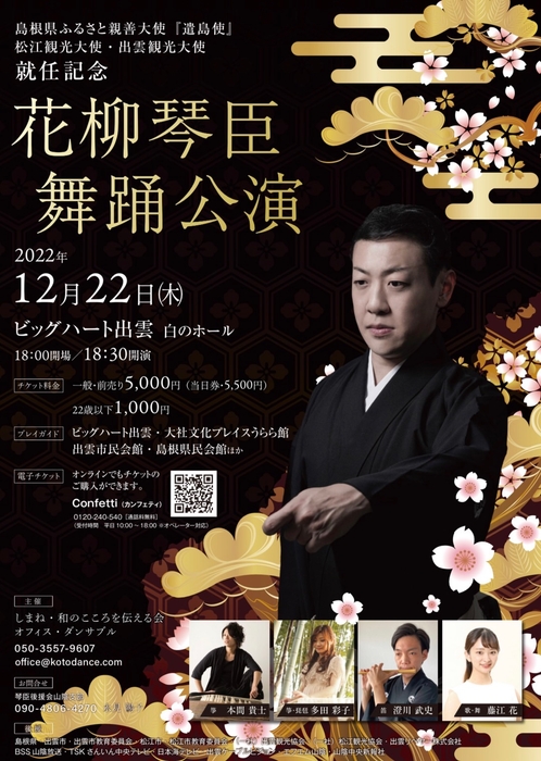 しまね和のこころを伝える会/株式会社オフィス・ダンサブル主催、『島根県ふるさと親善大使「遣島使」 松江観光大使/出雲観光大使 就任記念「花柳琴臣舞踊公演」』が2022年12月22日(木) にビッグハート出雲・白のホール(島根県出雲市駅南町1丁目5)にて上演されます。