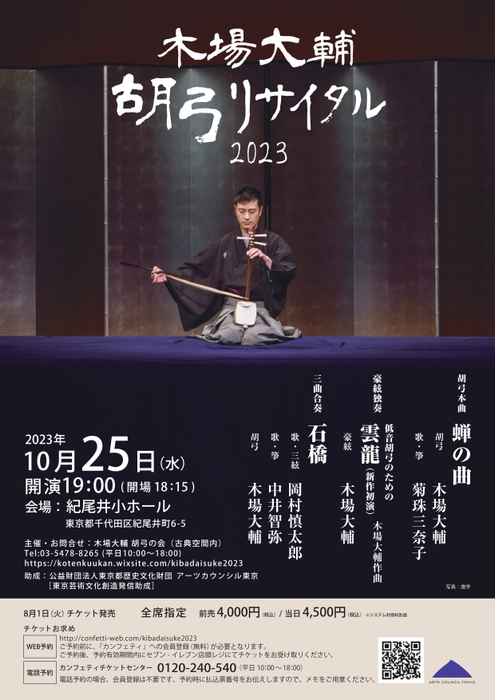 木場大輔 胡弓の会主催、『木場大輔 胡弓リサイタル2023』が2023年10月25日 (水)に紀尾井小ホール(東京都千代田区紀尾井町6番5号)にて開催されます。