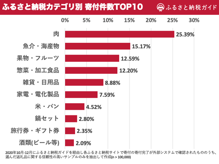 ・対象:2020年10月-12月にふるさと納税ガイドを経由し各ふるさと納税サイトで寄付の寄付完了が外部システムで確認されたもののうち、選んだ返礼品に関する信頼性の高いサンプルのみを抽出して作成(調査サンプル:10万件以上)