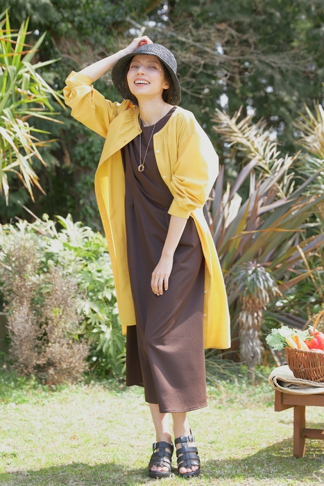 また、ハリと落ち感がある長袖タイプの「前開きシャツ」と「前開きワンピース」は、リラックス感がありながらもスッキリとしたシルエットで、1枚着としても、羽織りとしても着られる着回し力抜群の幅広いコーディネートで活躍する優秀アイテムです。