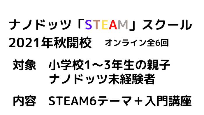 一般社団法人日本nanodots協会(本部:山口県光市三井5-2-12,代表理事 藤田順治)はナノドッツを使ったSTEAM教育のスクールを開校することになった。対象は小学校1年生から3年生。オンライン形式で月1回全6回コース。