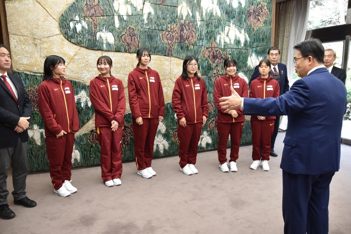 これに対し、大村知事は「富士山女子駅伝では圧倒的な内容で優勝し、しかも4年生は1人という若いチームで、今後も名城大学の時代が続くと印象付けた大会だったと思います」と称え、さらに「来年も2冠という目標に向かって素晴らしい成果が挙げられるよう期待しています」と激励しました。