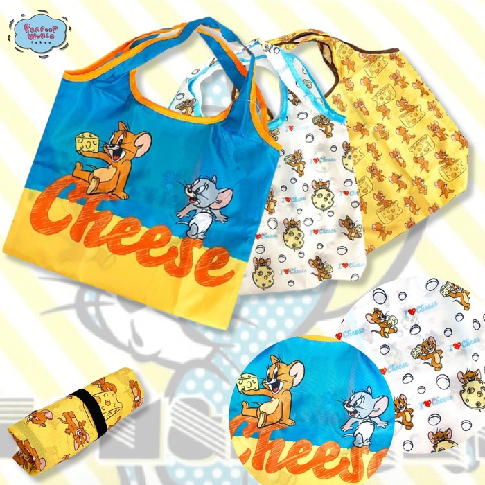 こちらは、イエロー地にジェリー&チーズデザインのエコバッグです。チーズの上に乗っかったり、いろいろなポーズのジェリーが総柄になっていてオススメのデザイン♪