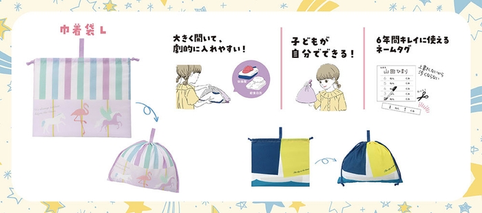 ●巾着袋L:大きく開口するので、体操服や給食白衣が出し入れしやすいです。
