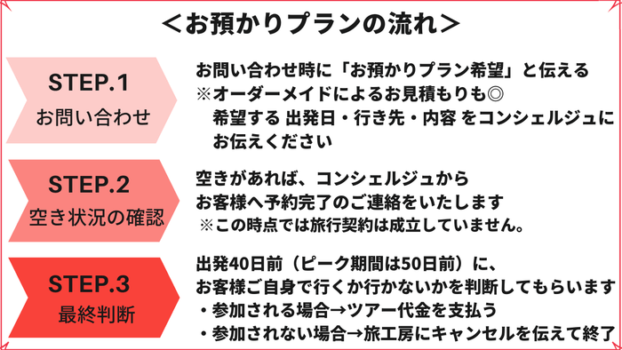 年末年始や、ゴールデンウィークの予約は今のうちに! まずは、申込金の支払いなしでご希望のツアーを手配! 7月13日 より「お預かりプラン」として予約受付開始