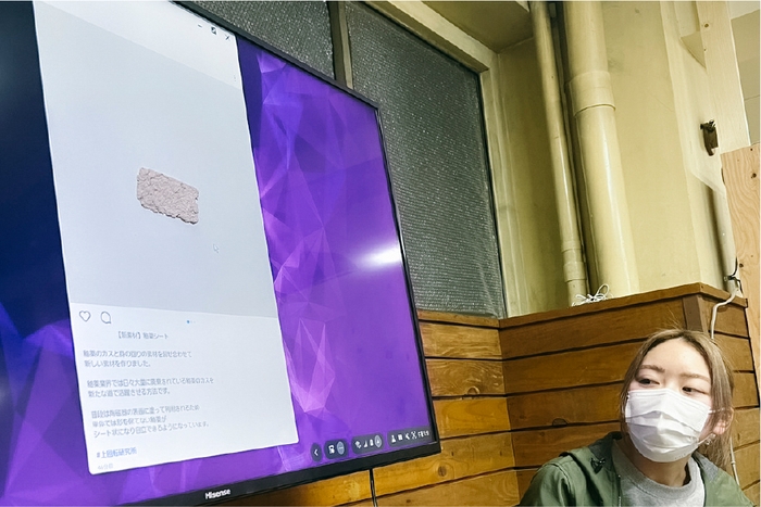 2日間に渡ってワークショップに参加していたのは、都市情報学部都市情報学科1年の岡田まどかさん。出身地である瑞浪市での開催と聞いて、気軽な気持ちで参加したといいますが、最終的には釉薬の汚泥を使った新素材シートをつくるところまで到達しました。