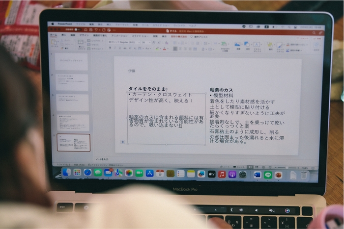「ワークショップではたくさんのアイデアが出ていて面白かったです。私は1日目の工場見学の後、砕いたタイルを土のパウダーにして食用する案や釉薬の汚泥を使って土鍋を作る案などを出しました。アフリカなどで起こっている食糧難の問題に興味があって、土食ができれば、役に立つのではないかと思ったからです。ただ安全性を調べるのが難しく、実現はなかなかできそうにありませんでした。
