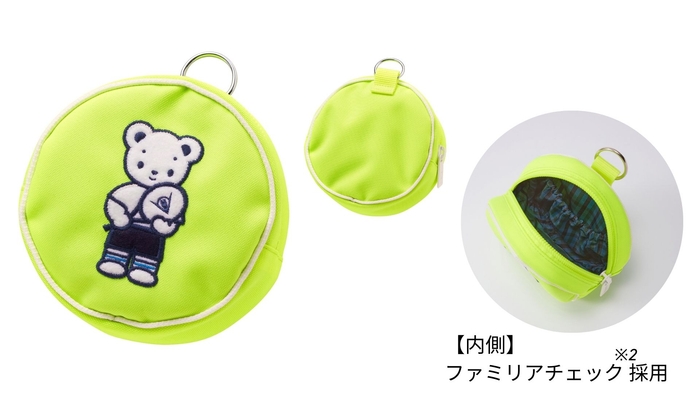 ファミリアのオリジナルキャラクター「ファミちゃん」がラケットを手に持ったデザインのポーチ。テニスボールをイメージした遊び心のあるデザインがポイントです。内側には青系のファミリアチェック※2のポリエステル生地を採用し、内ポケット付きで、コンパクトながら利便性もあります。また上部にはリングが付いており、ストラップやナスカンなどを取り付けてご使用いただけます。