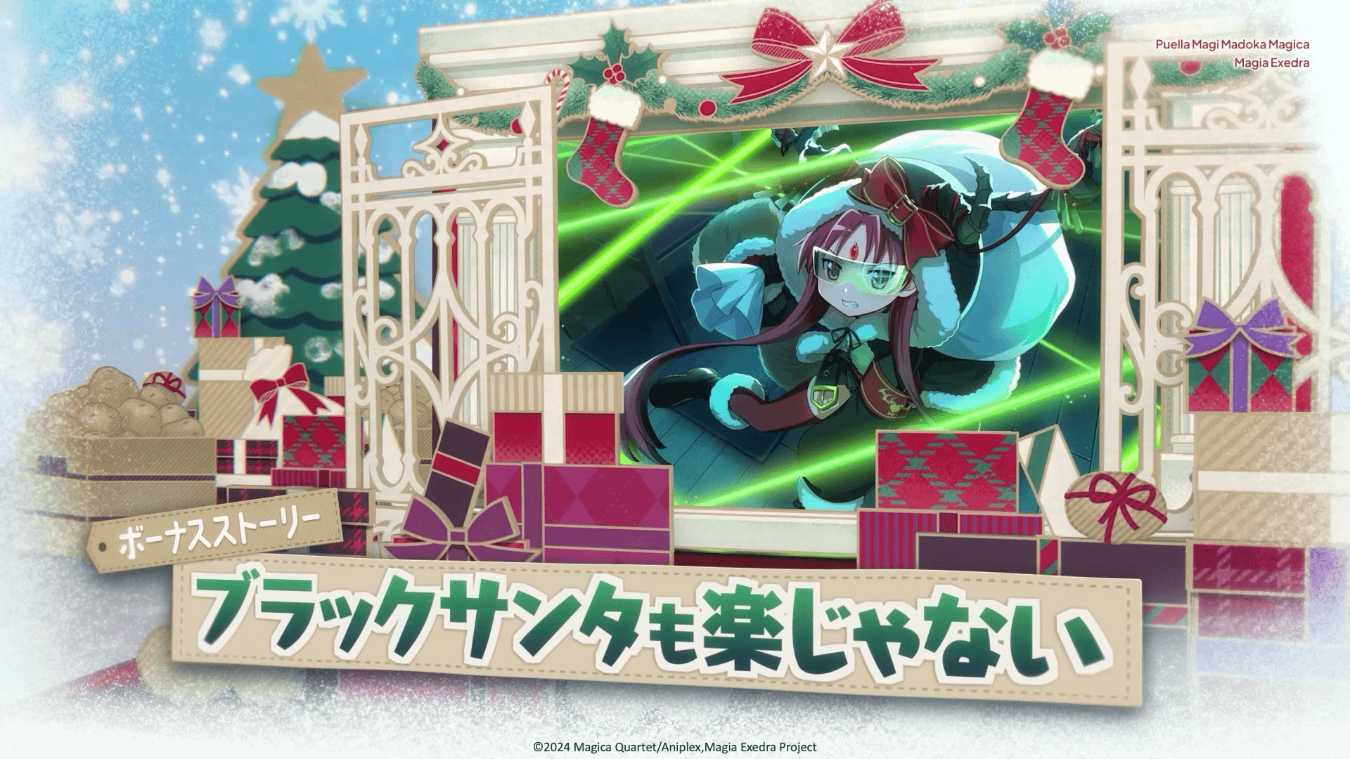 株式会社アニプレックス(本社:東京都千代田区 代表取締役 岩上敦宏 以下アニプレックス)は、アプリゲーム『魔法少女まどか☆マギカ Magia Exedra』(Magia Exedra:マギアエクセドラ)において、現在開催中のクリスマスイベント「聖マギカ学園のクリスマス ~ホワイトサンタ編~」に続き、12月11日(木)12時より後編イベント「聖マギカ学園のクリスマス ~ブラックサンタ編~」を開始し、新限定★5キオク クリスマス杏子が登場する初回10連無料のピックアップガチャを開始いたしました。