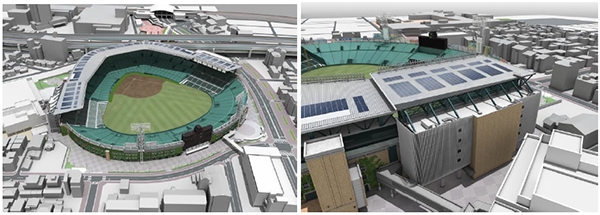 当球場は1924年に開業し、昨日(8月1日)、開場100周年を迎えました。本日から始まる新たな100年においても野球の聖地としてその歴史を紡いでいくため、「歴史と伝統の継承」を基本にしながら、太陽光パネルの設置や外壁におけるリサイクル素材の活用等、この度の銀傘拡張においても「サステナビリティ」の観点から環境負荷の低減に取り組みます。