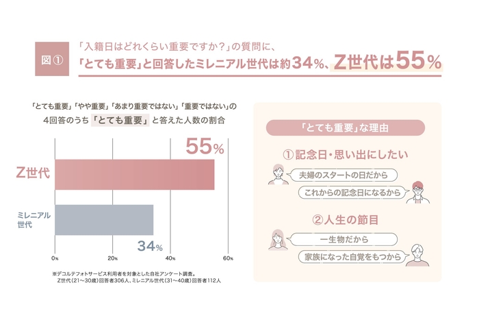 特にZ世代(21~30歳)では、入籍日を「とても重要」と考える人が55%にのぼり、ミレニアル世代(31〜40歳)の34%と比較してもその傾向は顕著です(図①)。