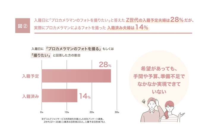 一方で、「プロカメラマンに写真を撮ってもらいたい」と答えたZ世代の入籍予定者は28%に対し、実際にプロカメラマンによる写真を残せた入籍済カップルは14%にとどまっています(図②)。