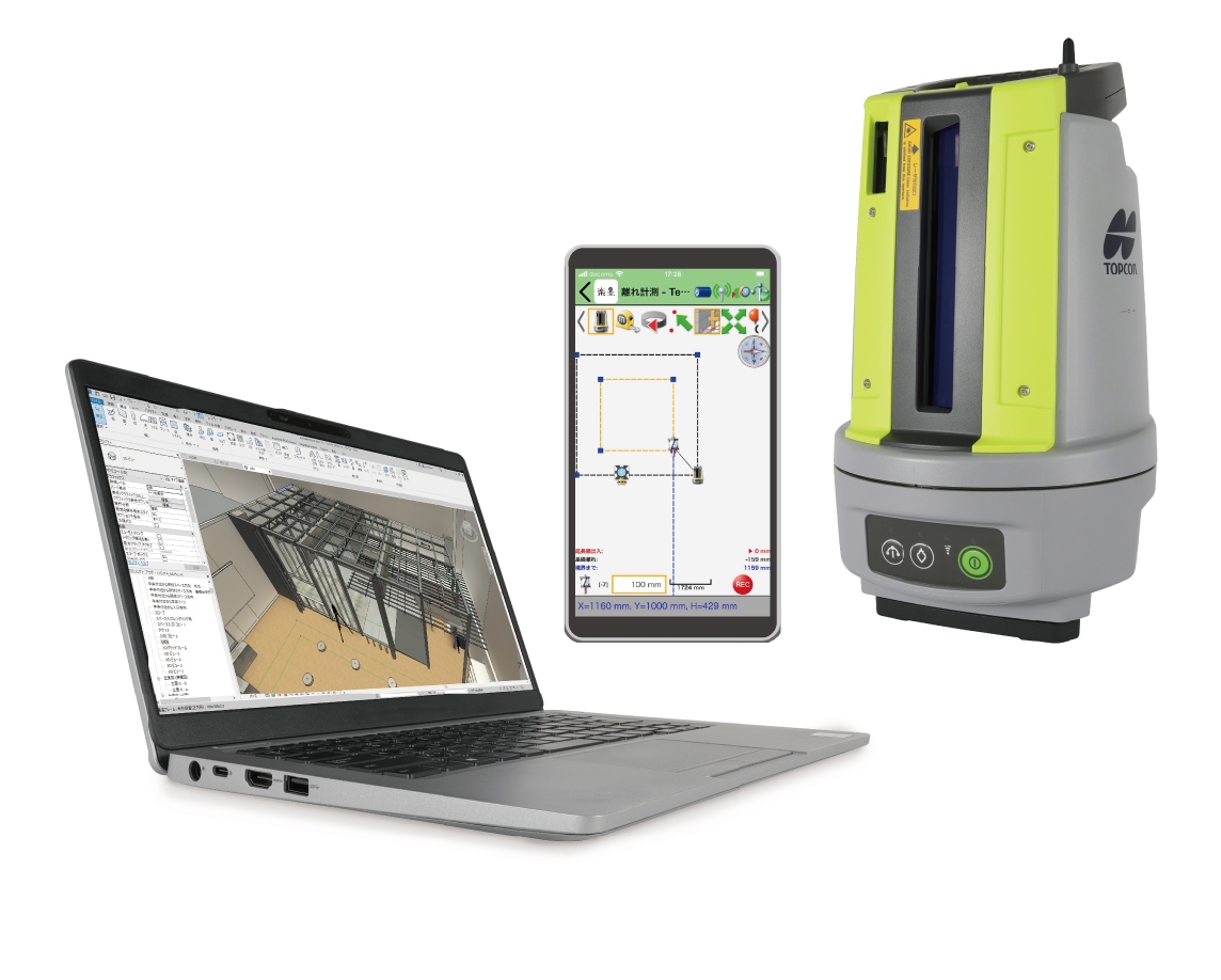 高精度位置出し機『楽位置』(らくいち)と、スマホ用建築現場向けワンマン位置出し誘導アプリケーションソフトウエア『楽墨』(らくずみ)による「建築施工向けのワンマン位置出しシステム」は、技能者不足に課題を抱える施工現場において、誰でも、1人で、簡単に位置出しや検査を行えることにより、作業者の人員削減と作業時間の短縮に大きな効果があると、発売以来ご好評をいただいております。