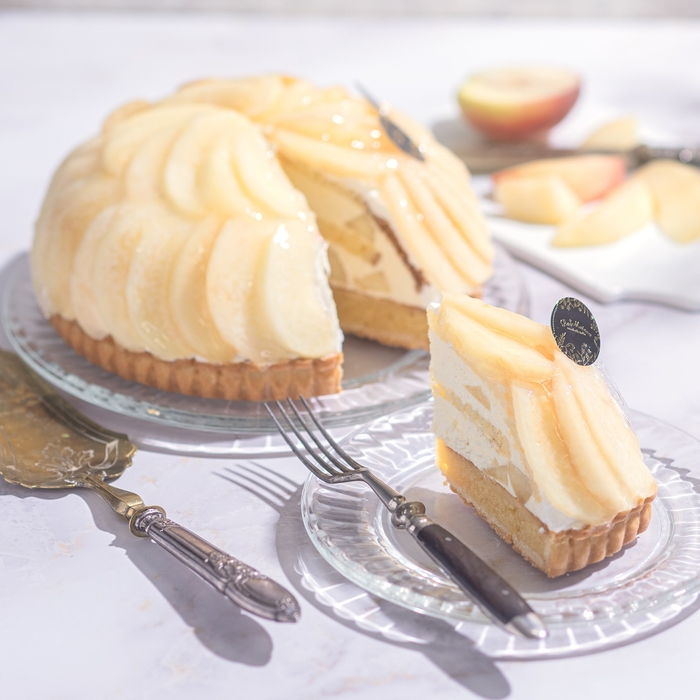 商品詳細:しっとりと焼き上げたケークタルトに華やかなジャスミンが香るミルクティークリームとフルーティーなパインジャムを重ね、甘く爽やかな酸味のパイナップルとみずみずしい白桃を飾りました。