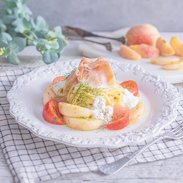商品名:白桃とフルーツトマトの冷製パスタ 〜生ハム・桃ジュレ添え〜