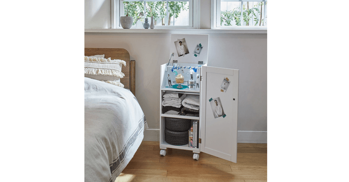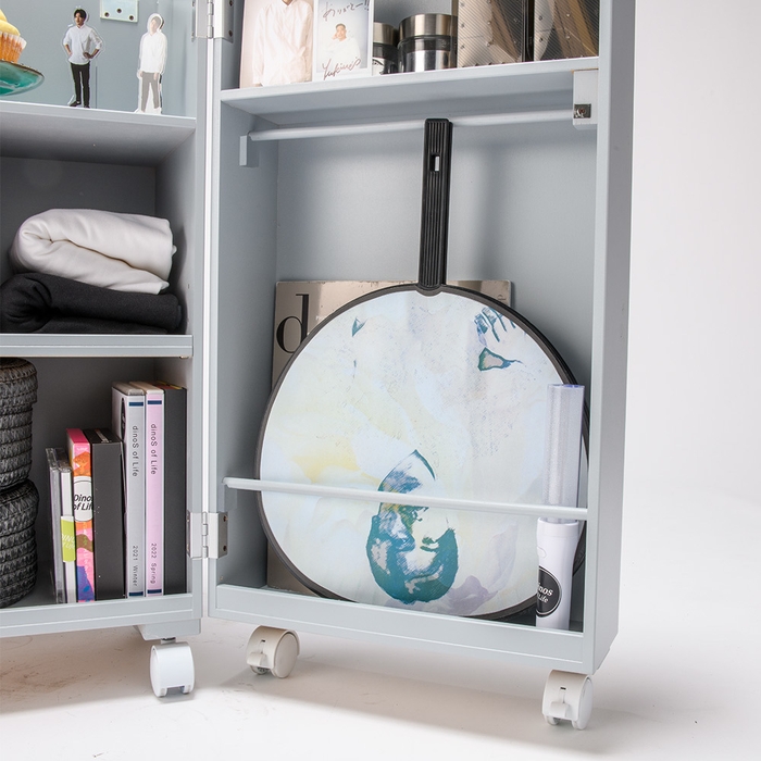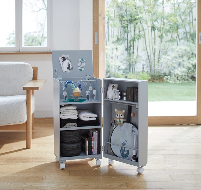 当初はライトグレーとホワイトの2色で発売。来客や家族の目に触れたくないという意見をもとに隠せる収納に。ワゴンを閉じればすっきりとコンパクトになります。キャスター付きで移動できるので、来客時に人の目を気にすることがありません。見た目は普通のワゴン、開ければ“推し祭壇”というコンセプトが人気となりました。