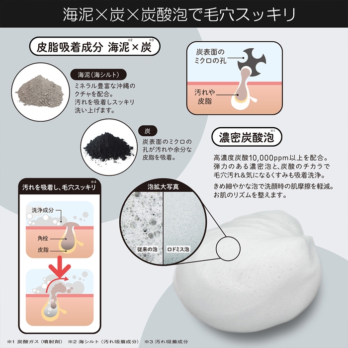 沖縄県産の海泥(海シルト)※2&炭※3を配合し毛穴汚れや皮脂汚れを吸着。古い角質によるくすみも落としてすっきり肌※4に。