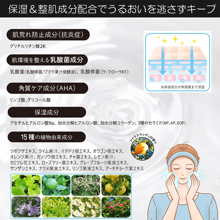 ●15種の植物由来成分:ツボクサエキス、ライム果汁、イタドリ根エキス、オウゴン根エキス他
