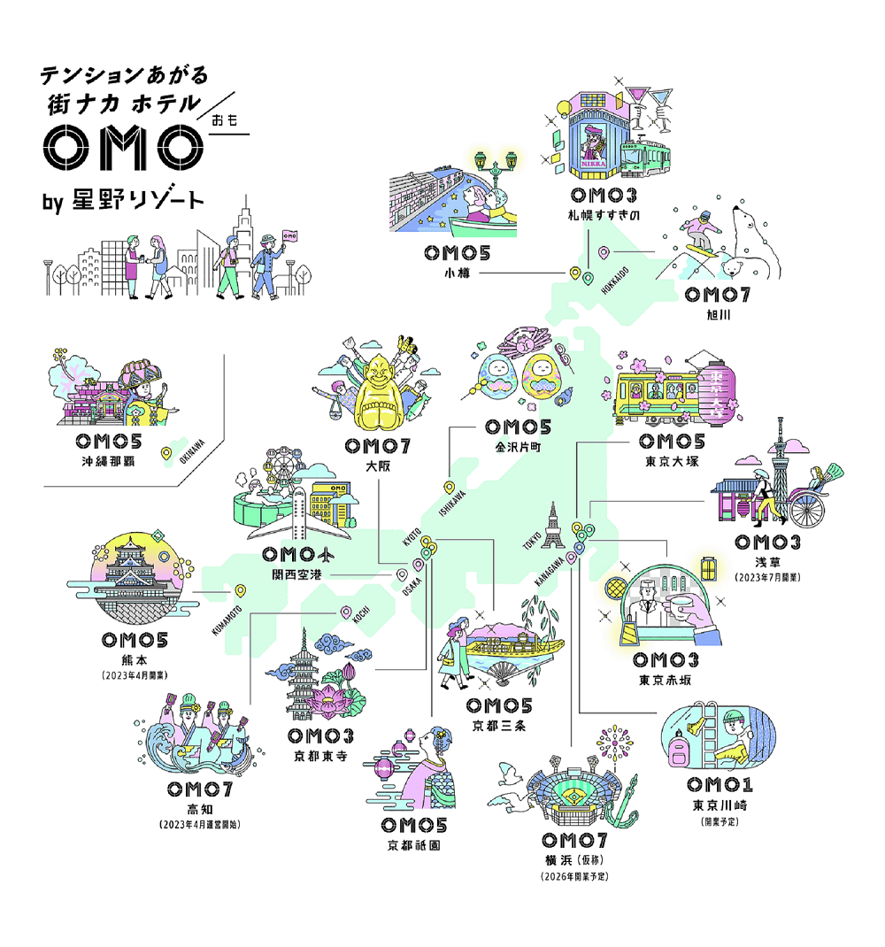 「OMO」は星野リゾートが全国に展開する都市ホテルブランドです。ブランドコンセプトは「テンションあがる『街ナカ』ホテル」。地域と一体となって街を楽しみ尽くす旅を追求しています。全ての OMO で、街歩きをサポートする Go-KINJO サービスを展開。全国各地の14施設から「都市観光」の楽しさを発信していきます。